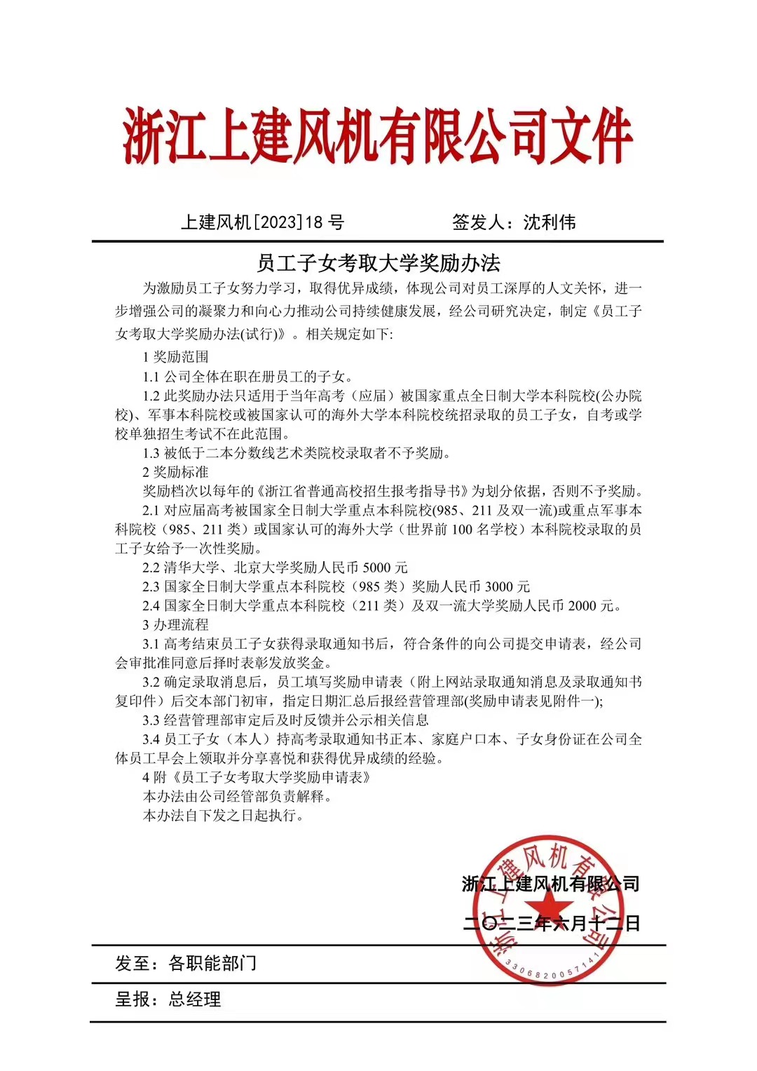 公司出臺《員工子女考取大學(xué)獎勵辦法》
